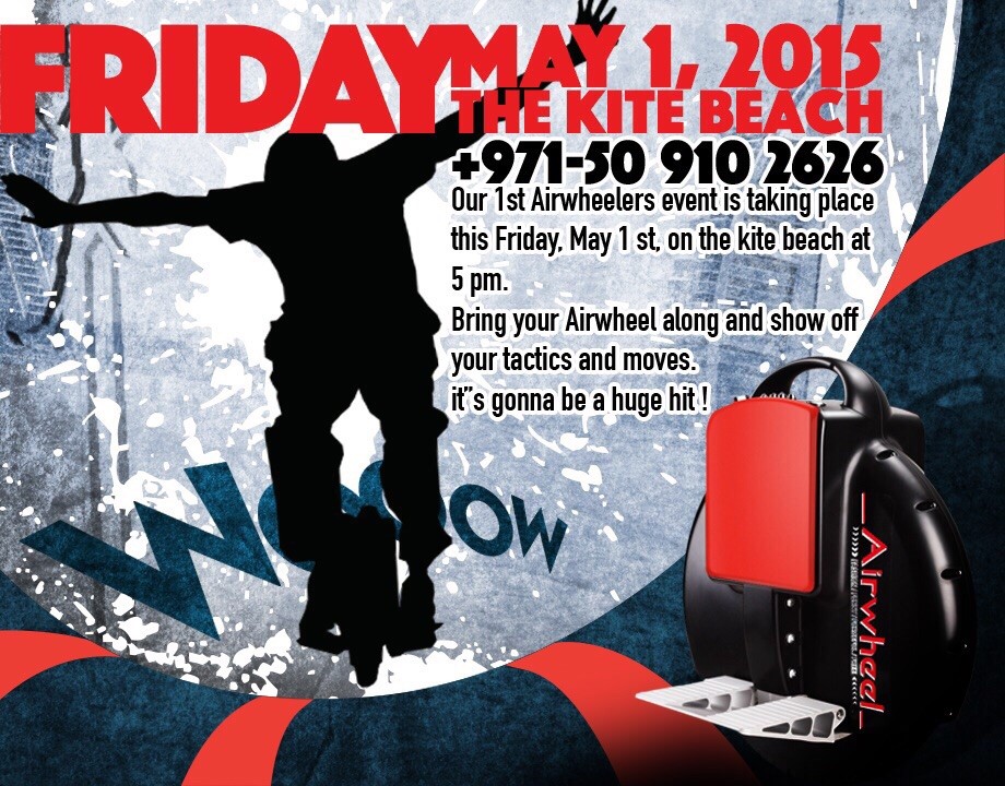 • The first ever Airwheelers event is going to take place on the kite beach of Dubai. Airwheelers can go to the kite beach at 5 pm on Friday to show off tactics and moves and even have chances to win Airwheel units.